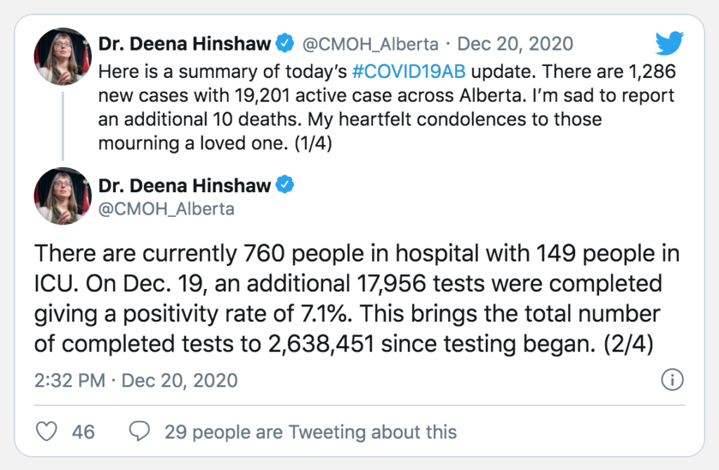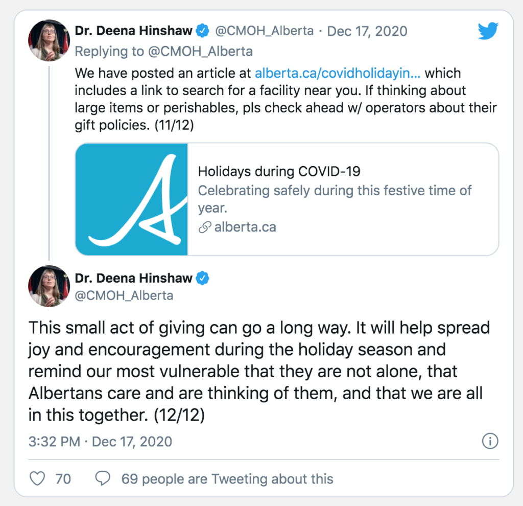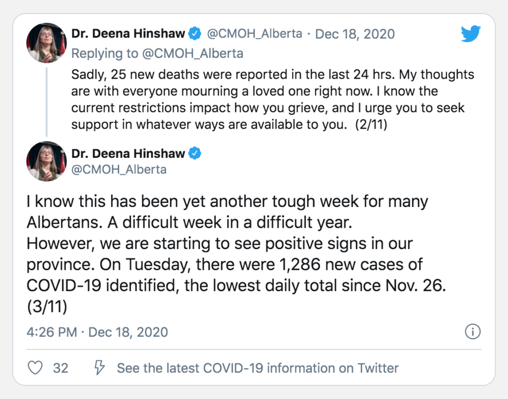 Dr. Deena Hinshaw’s tweets consistently leave out relevant information, and are therefore misleading Albertans.