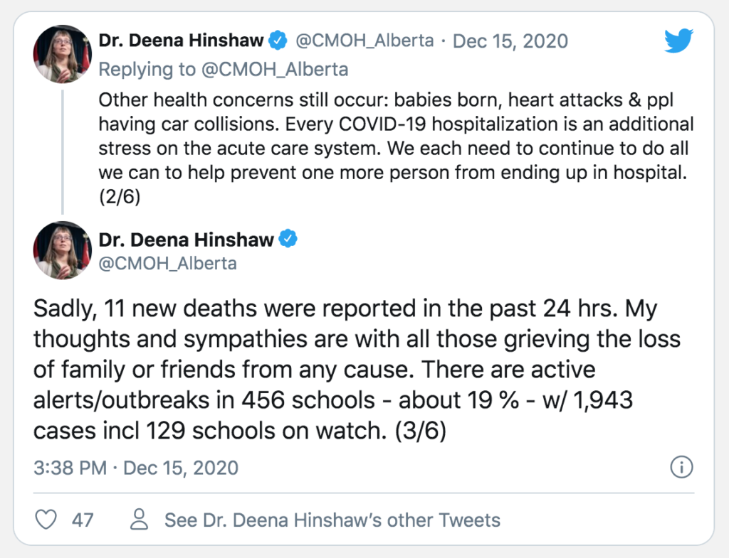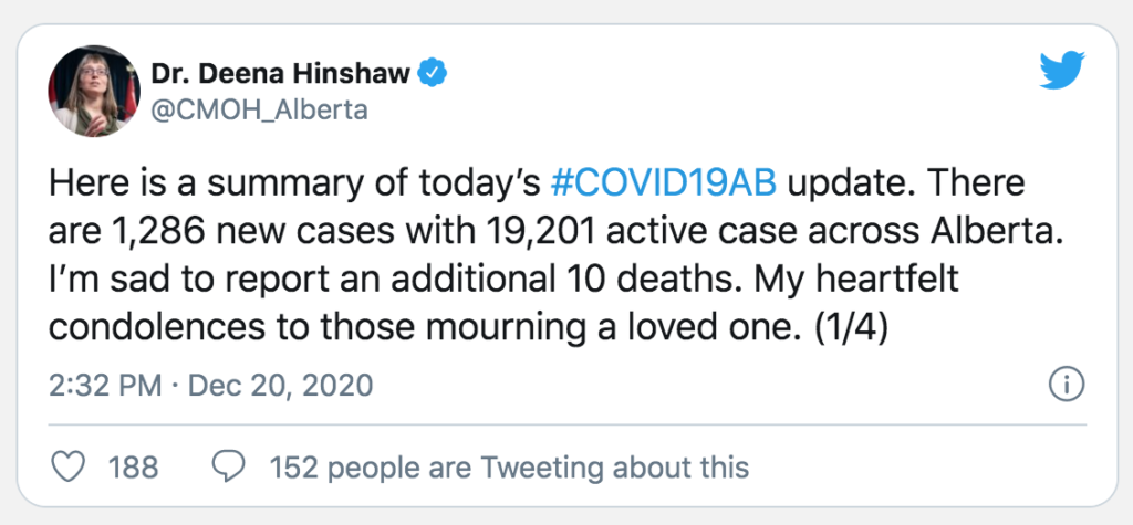 On December 20, Dr. Hinshaw tweeted that she was “sad to report an additional 10 deaths” from COVID-19, but makes no reference to the other 490 Albertans who also died in the preceding week, or to the more than 2,000 Albertans who died in the preceding month, or to the more than 27,000 Albertans who have died in the past year. Every death is sad.