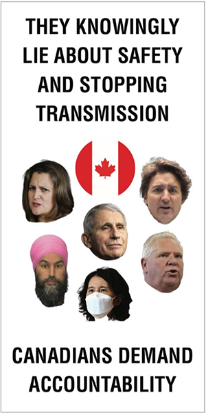 The sign read, âThey knowingly lied about safety and stopping tranmission [sic],â and âCanadians demand accountability.â The sign also featured an image of two hammers behind a Canadian flag. Mr. Katerberg said the design was inspired by a symbol from the 1979 Pink Floyd album, The Wall, which addressed government overreach.