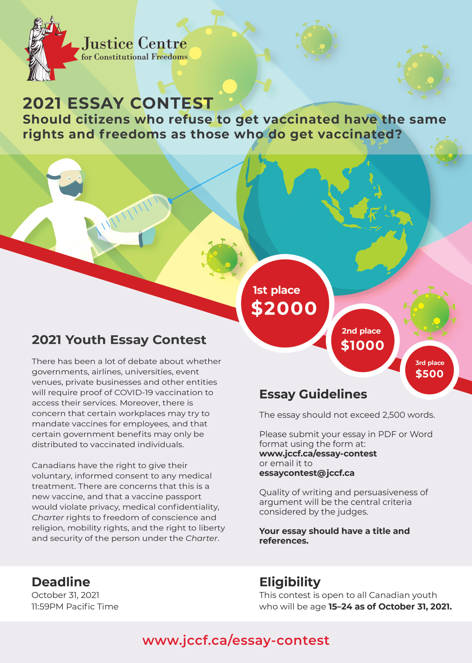 The essay should be a MINIMUM of 1000 words and NOT EXCEED 2,500 words. Please submit your essay in PDF or Word format using the form below, or email it to essaycontest@jccf.ca. Quality of writing and persuasiveness of argument will be the central criteria considered by the judges.