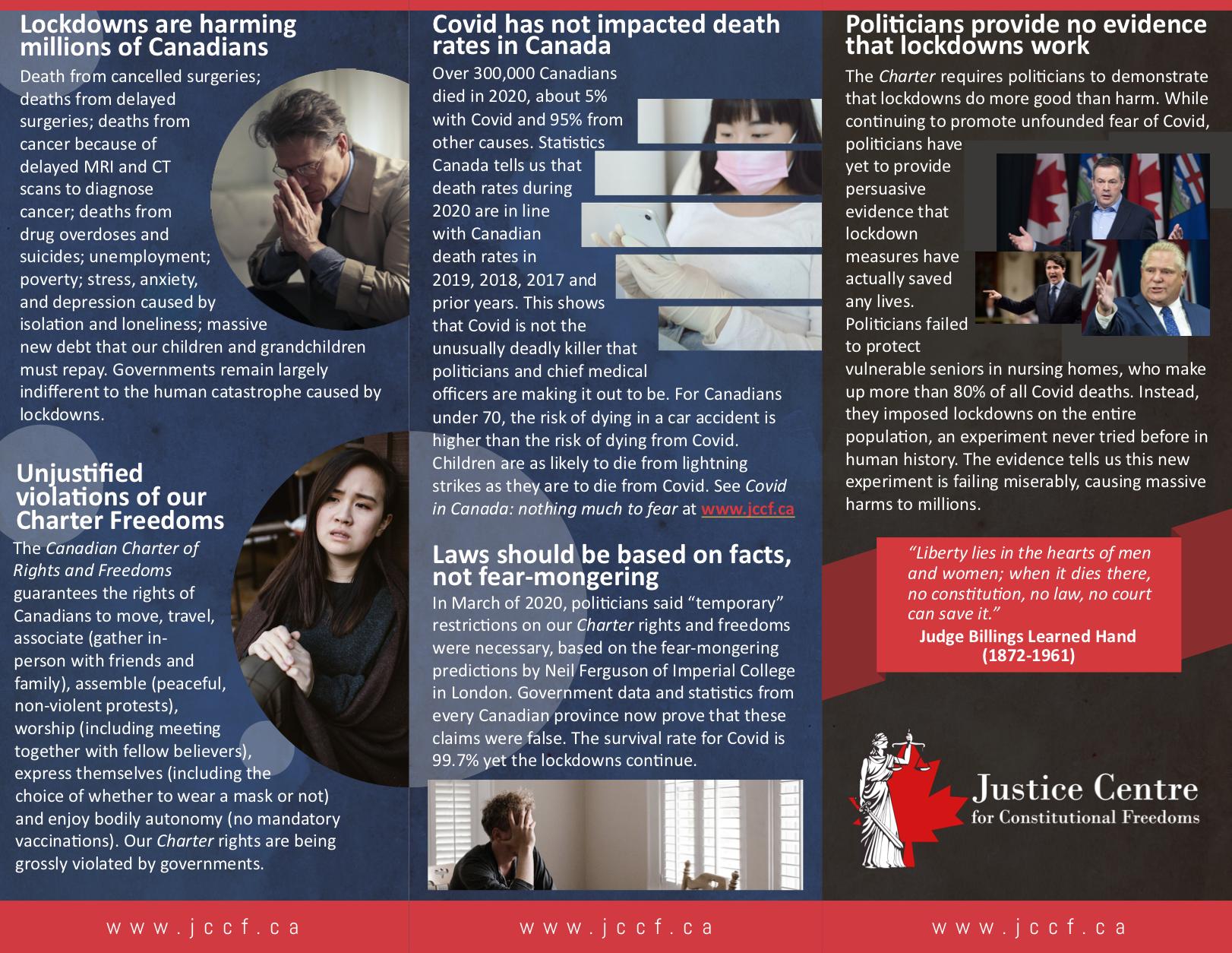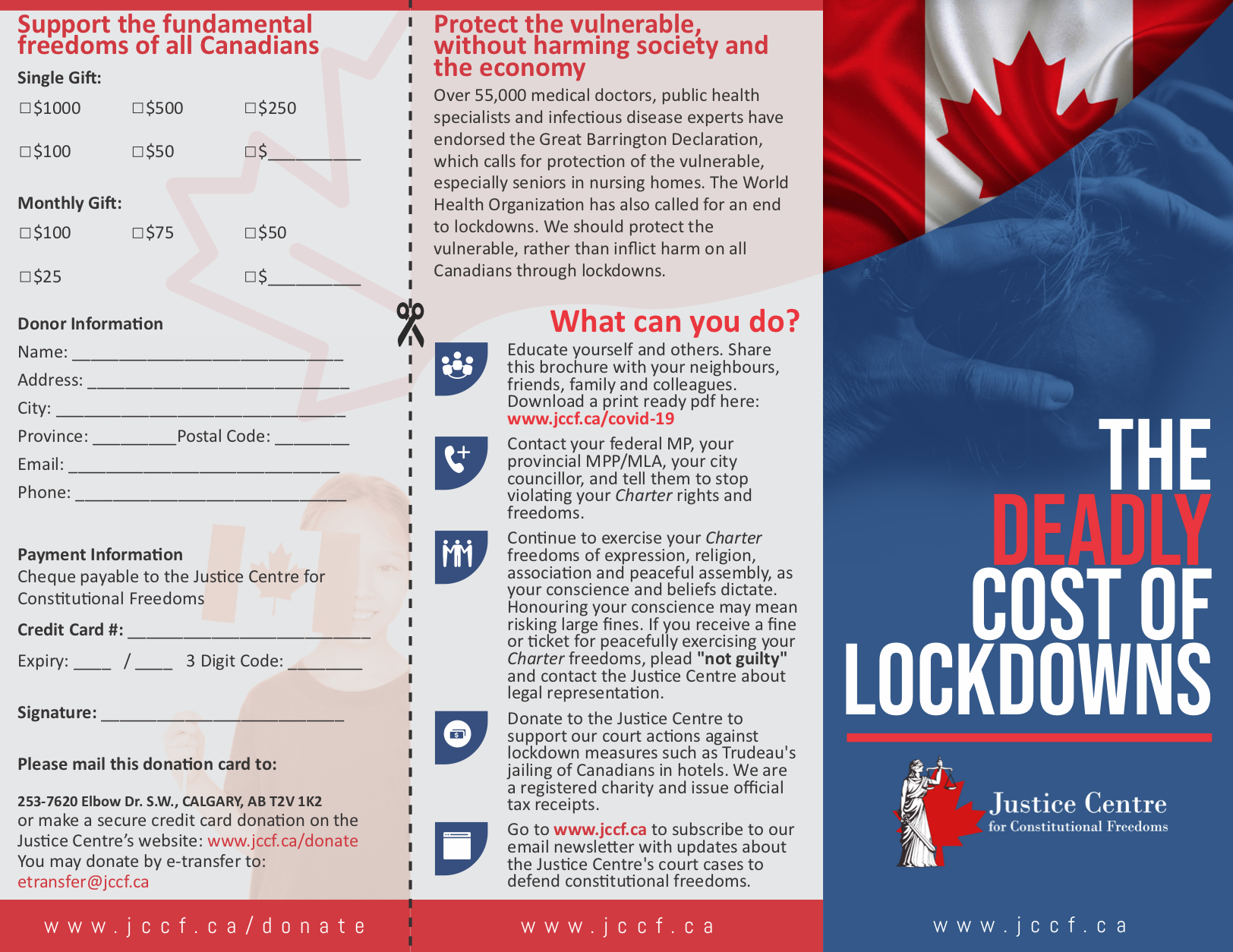 The Justice Centre is looking for volunteers to distribute a new brochure to inform Canadians about their Charter rights and freedoms in the context of the lockdowns, entitled The Deadly Cost of Lockdowns. If you are interested in giving a hard copy and/or email version of this brochure to your friends, families, colleagues and/or neighbours, please let us know and we will send you more information.