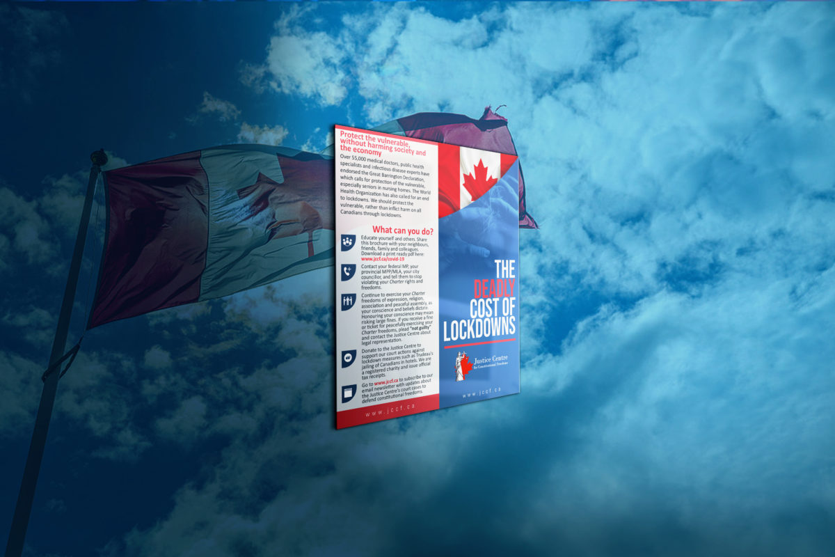 The Justice Centre is looking for volunteers to distribute a new brochure to inform Canadians about their Charter rights and freedoms in the context of the lockdowns, entitled The Deadly Cost of Lockdowns. If you are interested in giving a hard copy and/or email version of this brochure to your friends, families, colleagues and/or neighbours, please let us know and we will send you more information.